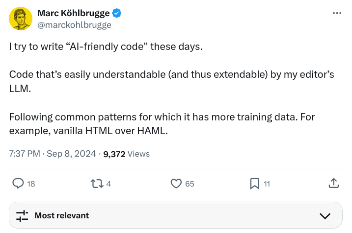 Using Tailwind CSS instead of other design patterns–patterns you would have to teach the LLMs, but if you use Tailwind, they already know it…