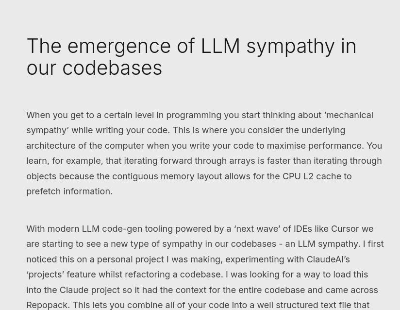 …it occurred to me that I had restructured my project to make it more LLM understandable – and this is likely my first instance of ‘LLM sympathy’. Structuring my code specifically to help the LLM tooling I was using to build it. I’ve noticed other people doing this too… – https://www.simonharris.co/emergence-of-LLM-sympathy-in-codebases